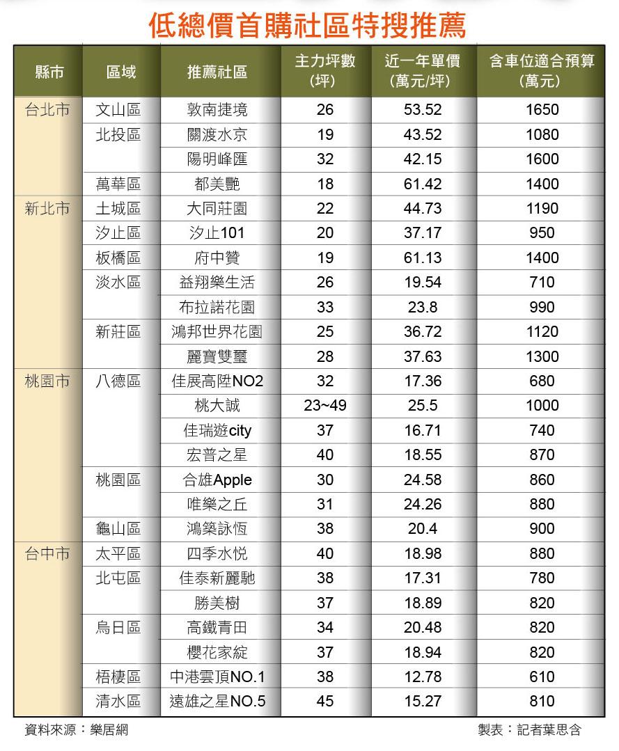 根據樂居網統計台北、新北、桃園、台中4大都會區含車位低總價捷運宅,與現有或規劃中的捷運站距離700公尺以內,特搜台北市總價1700萬元以下屋齡10年內2房、新北市1400萬元以下屋齡5年內2房、桃園市1000萬元以下屋齡5年內3房以及台中市900萬元以下屋齡5年內3房,並剔除夾層、挑高、工業區等有違規疑慮住宅,篩選百戶以上指標社區,發現4大都會區有不少適合新婚首購的捷運宅,可做為購屋族成家參考。