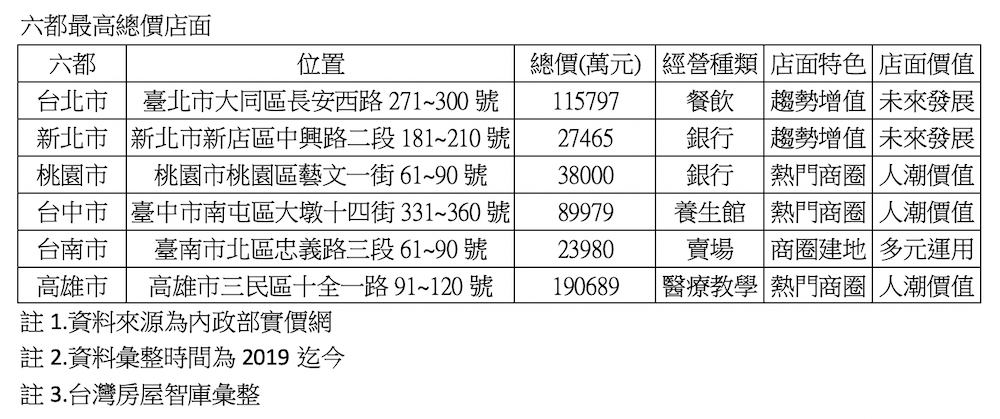 店面交易雖有降溫的狀態,不過仍有買家願意高價搶買金店面!台灣房屋智庫觀察去年迄今六都最高總價金店面,結果發現雖然像是桃園、台中、高雄仍是以熱門商圈為主,但大方出手買下雙北市高價店面,則看準趨勢增值效益,至於台南市在北區忠義路三段上的店面,目前開設量販店街邊店,為土地上自建物件,自行而多元的運用,服務在地居民,顯然如今店面要以高價交易,除了熱門商圈外,還得具備更多元價值。