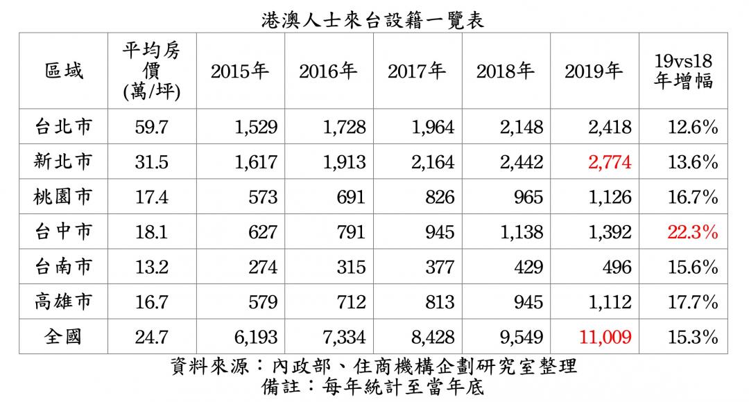 綜觀港澳人士來台設籍統計,2015年全國設籍人數6,193人,到2019年攀升到11,009人,4年來大幅成長77.8%,六都中,新北市一直都是設籍冠軍,其次為台北市,另外桃園、台中、高雄在去年設籍人數都破千,台中市去年設籍人數年增22.3%,是六都中成長最多者,僅台南市設籍人數未破500人。
